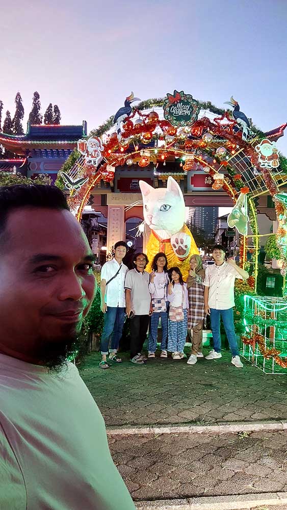 Kemudian berfoto di Patung White Cat (Kuching Putih) dengan baju yang selalu berganti sesuai musim dan event yang di kota Kuching, juga tempat wajib dokumentasi jika liburan ke kota Kuching